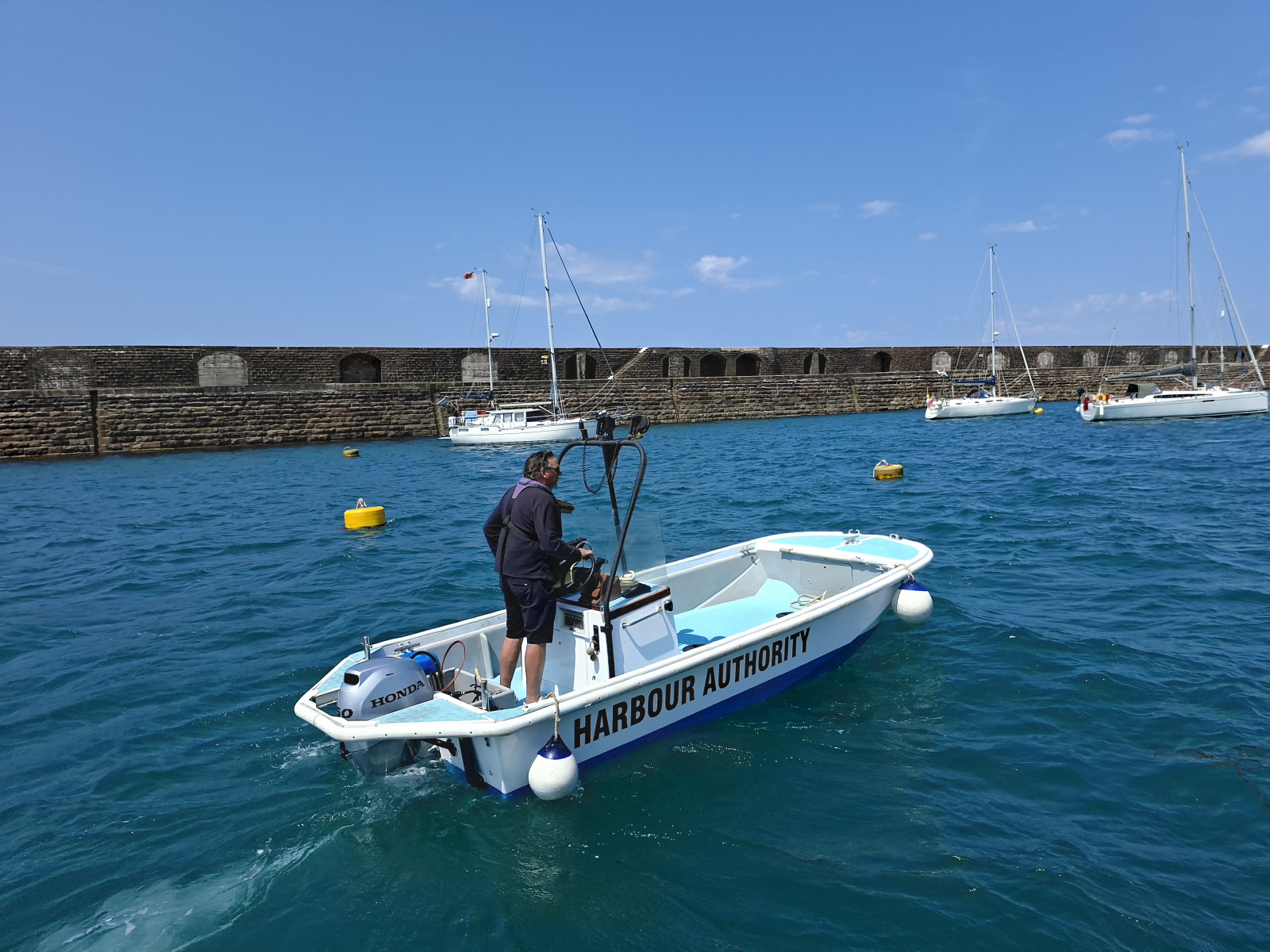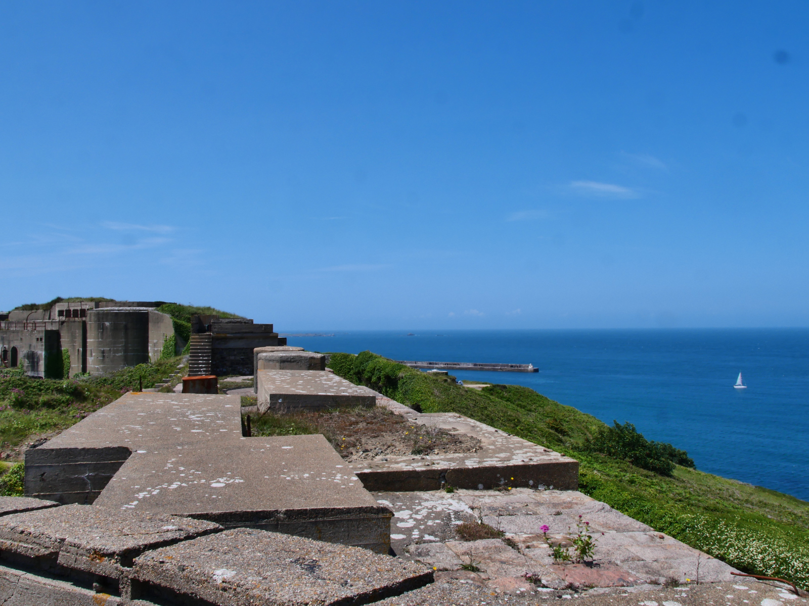 Unser erstes Ziel ist die nördlichste und drittgrößte Insel, Alderney. Im dortigen Braye Harbour gibt es keine Stege, sondern es liegen Mooringbojen aus: orangefarbene für Locals, gelbe für Besucher. Wir entscheiden uns für Nummer 19, die im Schutz der gewaltigen Kaimauer liegt, und kaum sind wir fest, kommt auch schon das Boot der Harbour Authority längsseits. Der sympathische Hafenmeister kassiert die Gebühr für die Boje, erklärt uns, wo Dinghydock und Dusche zu finden sind und wie die Einklarierung funktioniert: An Land befindet sich ein Kasten mit Formularen, von denen eins pro Schiff auszufüllen und in einen zweiten Kasten einzuwerfen ist. Danach dürfen wir die gelbe Flagge, die man vor dem Klarieren unter der Steuerbordsaling setzt, einholen und sind direkt auch auf Guernsey und Sark „legal“. Nun ja, ganz legal sind wir nicht, denn ein Schlumpf auf Flying Fish ist mit abgelaufenem Reisepass unterwegs. Doch das Interesse an solchen Details scheint hier zum Glück nicht allzu groß und – Spoiler! – niemand wird je nachfragen. Die Inselerkundung am Samstag ist ein großer Spaß: Von der Braye Bay laufen wir zunächst in den zehn Minuten entfernten Hauptort St. Anne, ein wahres Postkartenidyll. Nach etlichen netten Smalltalks auf der zentralen Victoria Street ist genug Proviant eingekauft, um einen Teil der Insel auf Küstenwegen zu umrunden. Wilde felsige Schönheit und hübsche Strände wechseln sich ab, das Meer leuchtet türkis. Dabei sind immer mindestens zwei, drei alte Gemäuer in Sicht: Unzählige Befestigungsanlagen sollten seinerzeit Napoleon I. abschrecken. Und natürlich wurde dieser Festungsgürtel von den deutschen Besatzern ab 1940 als Basis für Bunkeranlagen genutzt, von denen man viele auf eigene Gefahr betreten kann. Nach unzähligen Abstechern haben wir am Schluss knapp 20 Kilometer zurückgelegt, da fühlt sich der frisch gezapfte Cider im Pub „The Moorings“ dann wohlverdient an.