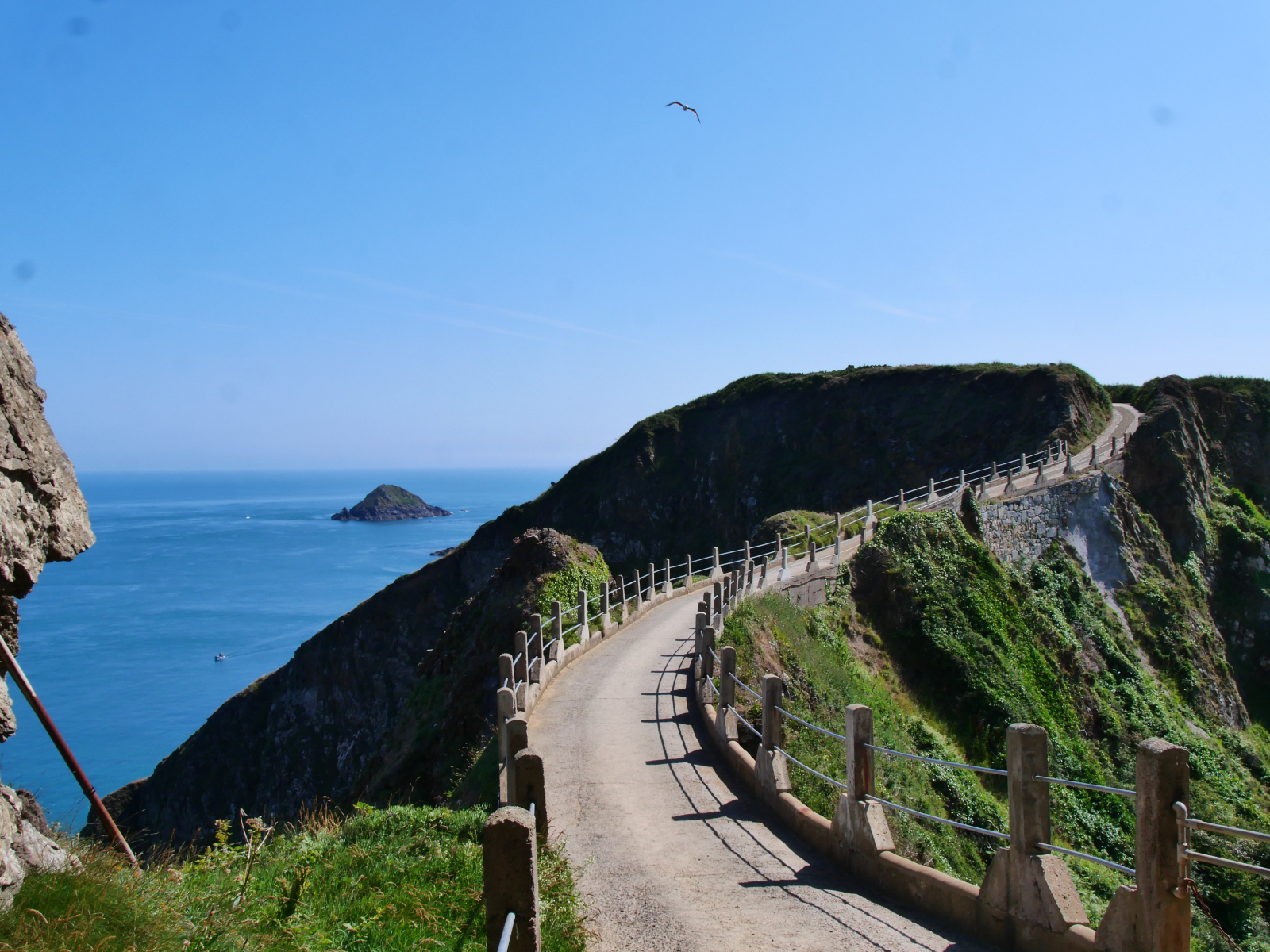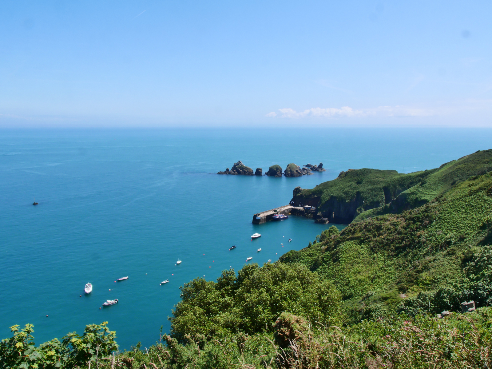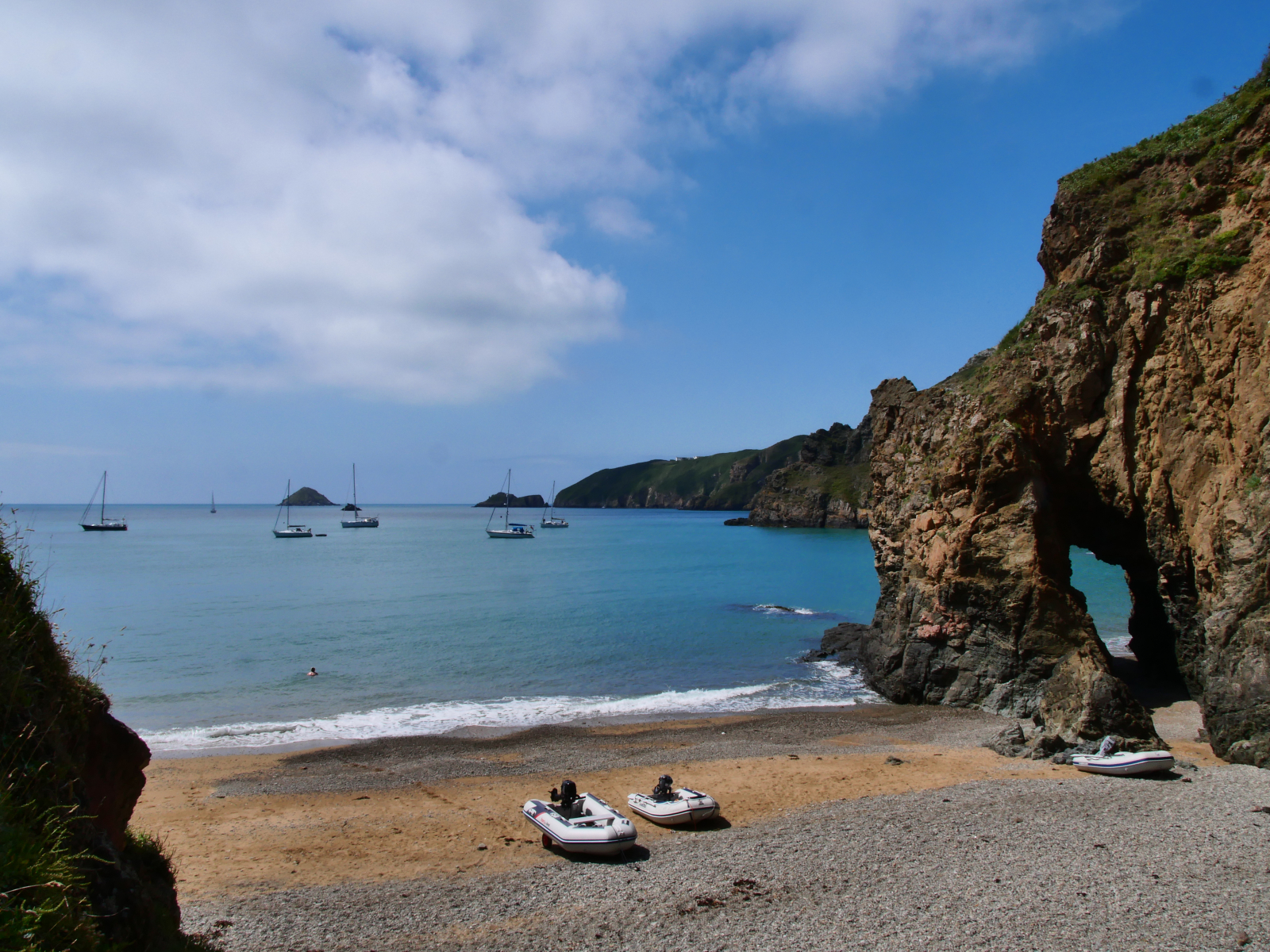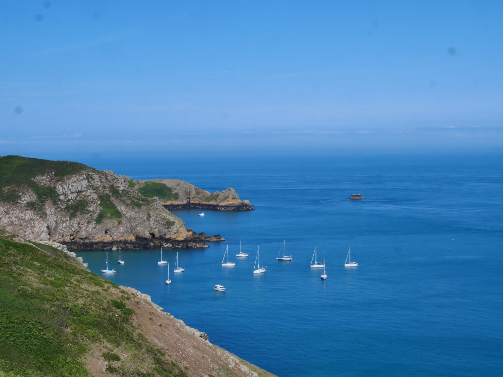 Am Sonntag legen wir ab gen Sark. Einen Yachthafen oder eine Marina gibt es nicht auf der viertgrößten Kanalinsel, so ankern wir in der hübsch von Felsen gerahmten Dixcart Bay auf der Ostseite. Nach einer ziemlich rumpeligen ersten Nacht sind wir froh, am Morgen mit dem Dinghy an Land zu fahren. Ein verwunschener Pfad führt aus der Bucht bergan, die Landschaft ist dschungelartig. Schon auf Alderney haben wir über das üppige Grün gestaunt, durch die geschützte Lage im Golf von Saint-Malo und den Einfluss des Golfstroms ist das Klima auf den Inseln mild. Hier auf Sark scheint die Natur geradezu zu explodieren. Nach kurzem Aufstieg erreichen wir „The Village“, auf der dortigen „The Avenue“ spielt sich das öffentliche Leben ab, hier gibt es Gastronomie, eine Handvoll Shops mit Kunsthandwerk und einen kleinen Supermarkt. Sark ist autofrei, Traktoren sind die einzig erlaubten motorisierten Fahrzeuge. Touristen können Fahrräder ausleihen oder sich per Pferdekutsche herumfahren lassen. Wir laufen wieder zu Fuß, erst ganz in den Norden, später südwärts zu einer besonderen Attraktion: „La Coupée“ ist eine schmale Landverbindung zwischen den beiden Inselteilen Sark und Little Sark. Weil es auf beiden Seiten steil bergab meerwärts geht, muss man hier sein Fahrrad schieben und Pferdekutschen passieren die Landbrücke ohne ihre Passagiere, die erst auf der anderen Seite wieder einsteigen dürfen. Hm, für unseren Geschmack ein bisschen viel Gewese, es gibt schließlich Geländer, aber die Landschaft hier ist durchaus schön und uns bietet sich ein toller Blick auf „unsere“ Ankerbucht und Flying Fish. Inzwischen hat sich das Meer beruhigt, wir genießen einen friedlichen Abend und freuen uns über die Gesellschaft einer Möwe, die mit ihren lustigen rosa Füßen stundenlang auf unserem Außenborder balanciert und auf eine Dinner-Chance wartet. Letztlich erbeutet sie eine halbe Aprikose mit Nutella-Topping.