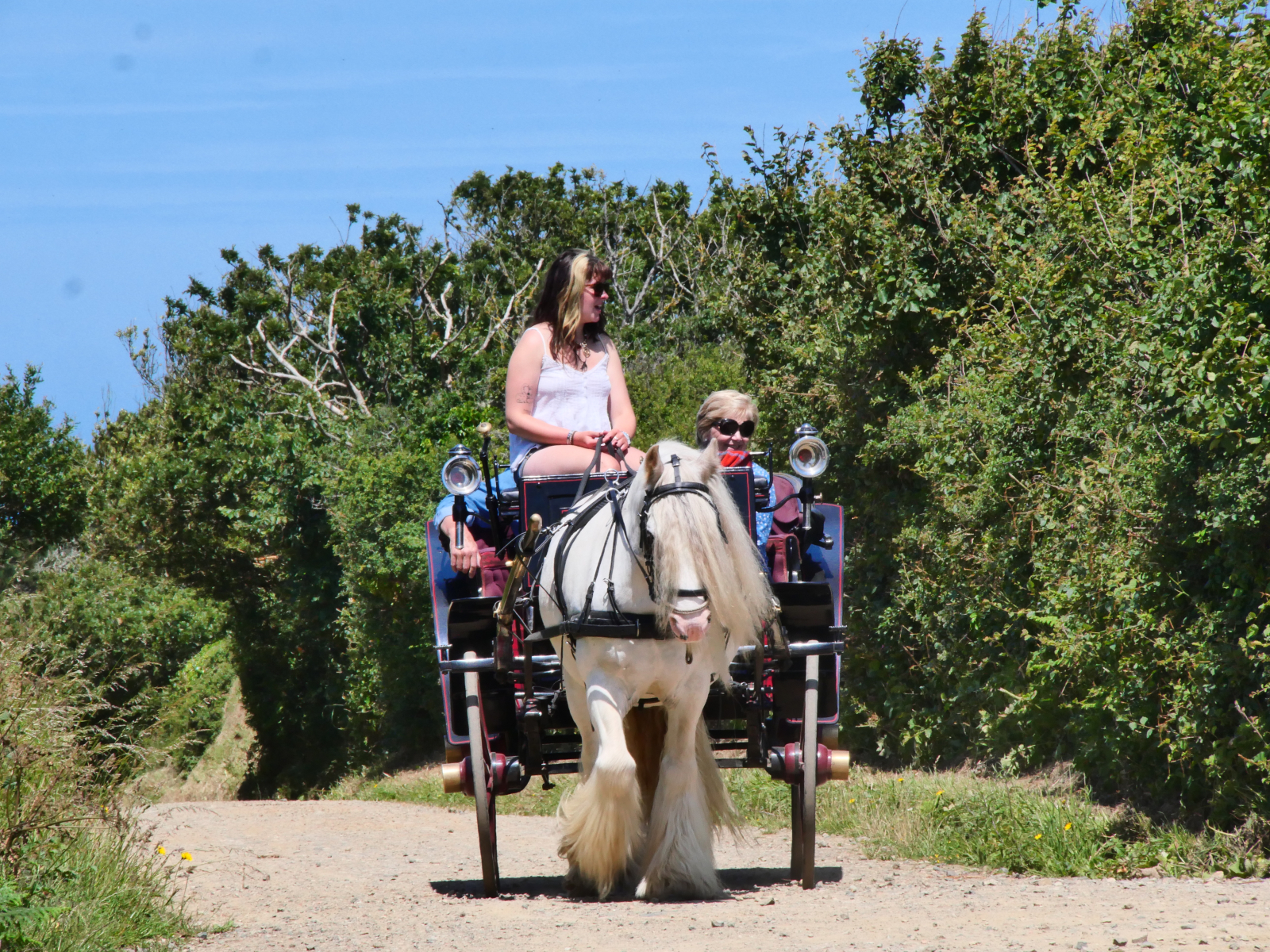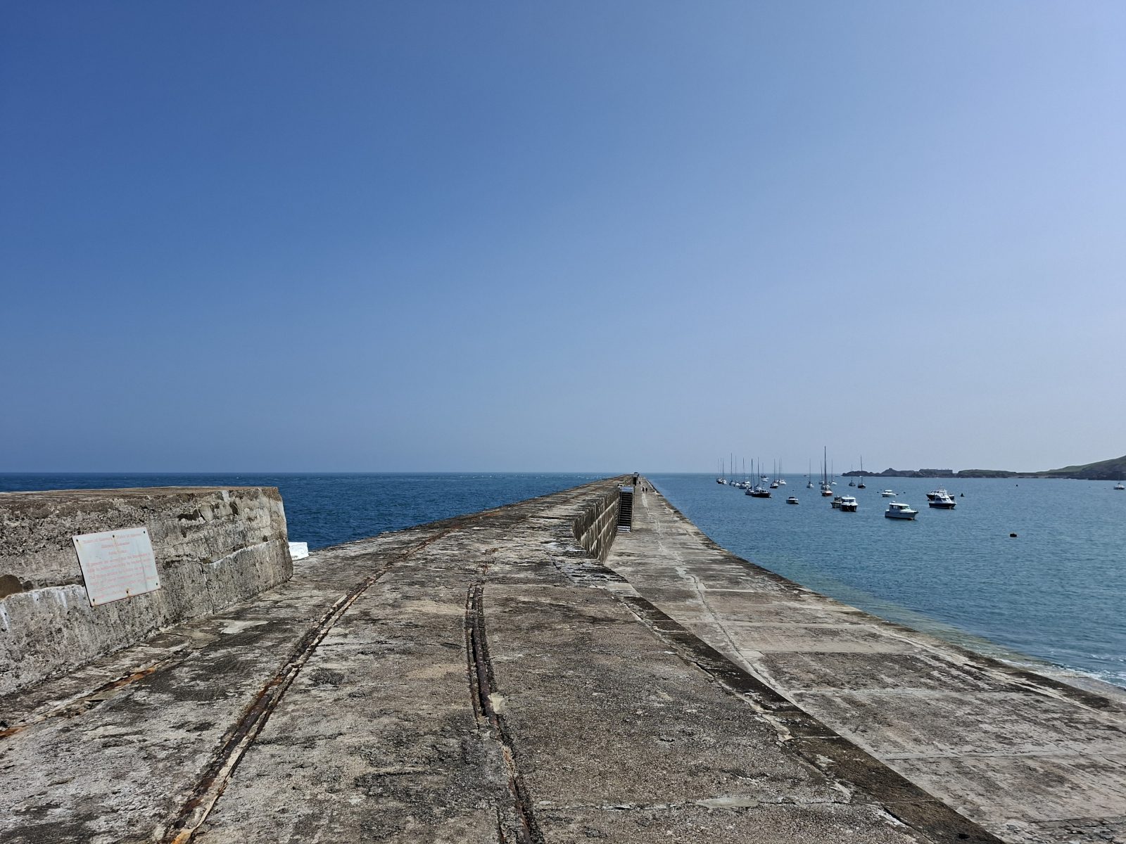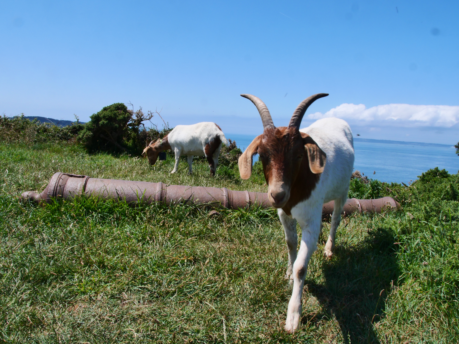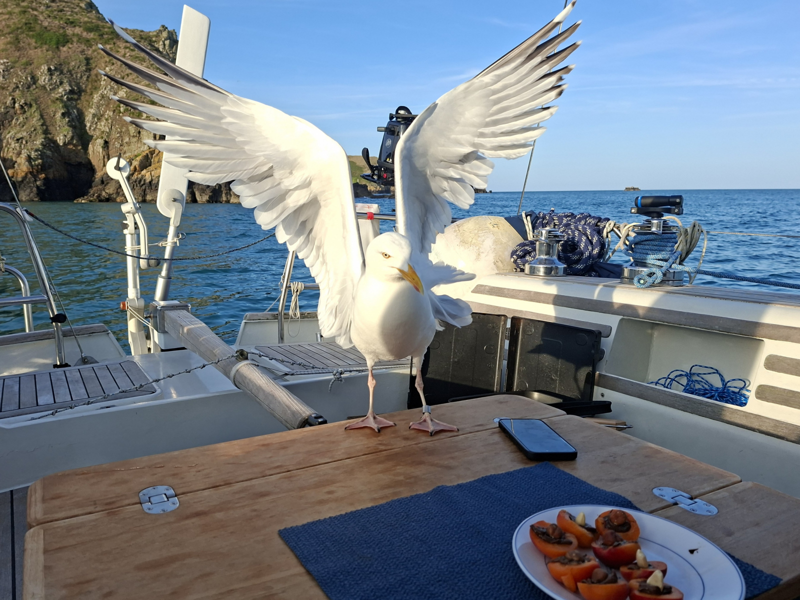 Am Sonntag legen wir ab gen Sark. Einen Yachthafen oder eine Marina gibt es nicht auf der viertgrößten Kanalinsel, so ankern wir in der hübsch von Felsen gerahmten Dixcart Bay auf der Ostseite. Nach einer ziemlich rumpeligen ersten Nacht sind wir froh, am Morgen mit dem Dinghy an Land zu fahren. Ein verwunschener Pfad führt aus der Bucht bergan, die Landschaft ist dschungelartig. Schon auf Alderney haben wir über das üppige Grün gestaunt, durch die geschützte Lage im Golf von Saint-Malo und den Einfluss des Golfstroms ist das Klima auf den Inseln mild. Hier auf Sark scheint die Natur geradezu zu explodieren. Nach kurzem Aufstieg erreichen wir „The Village“, auf der dortigen „The Avenue“ spielt sich das öffentliche Leben ab, hier gibt es Gastronomie, eine Handvoll Shops mit Kunsthandwerk und einen kleinen Supermarkt. Sark ist autofrei, Traktoren sind die einzig erlaubten motorisierten Fahrzeuge. Touristen können Fahrräder ausleihen oder sich per Pferdekutsche herumfahren lassen. Wir laufen wieder zu Fuß, erst ganz in den Norden, später südwärts zu einer besonderen Attraktion: „La Coupée“ ist eine schmale Landverbindung zwischen den beiden Inselteilen Sark und Little Sark. Weil es auf beiden Seiten steil bergab meerwärts geht, muss man hier sein Fahrrad schieben und Pferdekutschen passieren die Landbrücke ohne ihre Passagiere, die erst auf der anderen Seite wieder einsteigen dürfen. Hm, für unseren Geschmack ein bisschen viel Gewese, es gibt schließlich Geländer, aber die Landschaft hier ist durchaus schön und uns bietet sich ein toller Blick auf „unsere“ Ankerbucht und Flying Fish. Inzwischen hat sich das Meer beruhigt, wir genießen einen friedlichen Abend und freuen uns über die Gesellschaft einer Möwe, die mit ihren lustigen rosa Füßen stundenlang auf unserem Außenborder balanciert und auf eine Dinner-Chance wartet. Letztlich erbeutet sie eine halbe Aprikose mit Nutella-Topping.