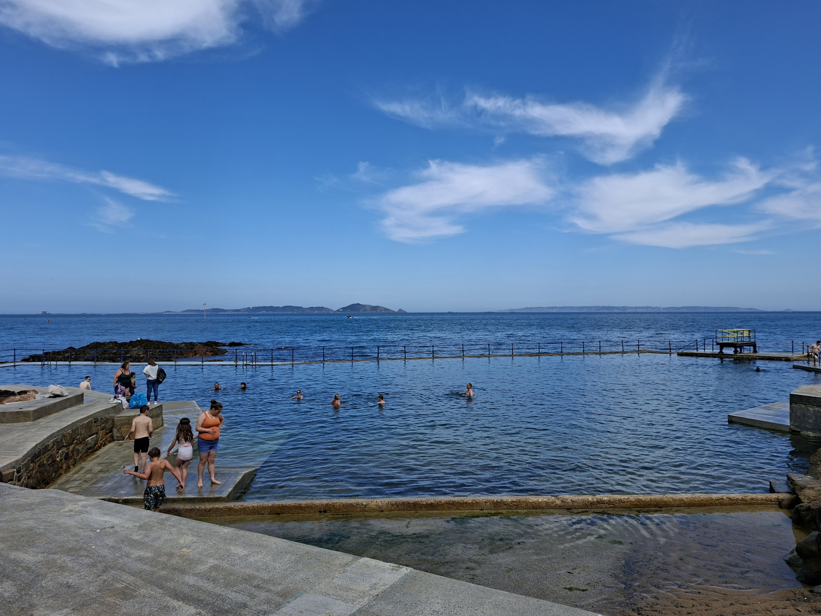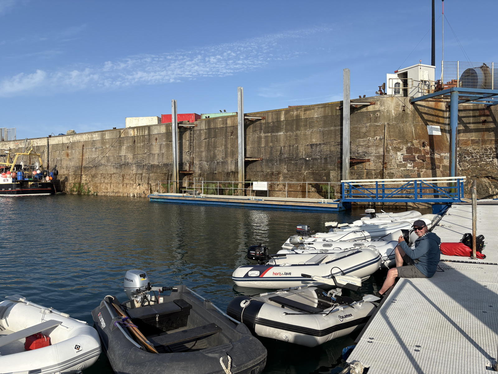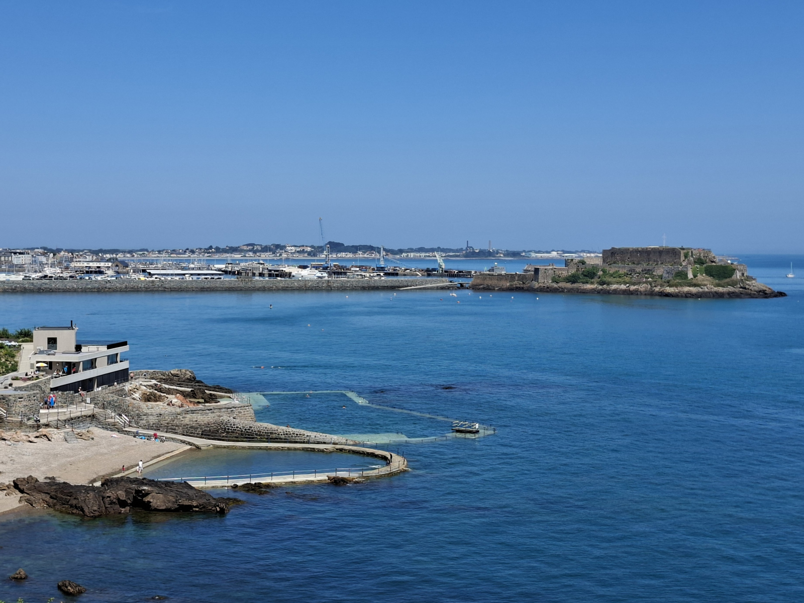 Von Sark ist es nur ein acht Meilen-Katzensprung zur benachbarten Insel Guernsey, der zweitgrößten mit rund 64.000 Einwohnern. Dort füllen wir unseren Tank mit steuerfreiem Diesel, funken dann, wie vorgeschrieben, die Victoria Marina an und bekommen einen passenden Liegeplatz zugewiesen, wo wir auch bei Niedrigwasser nicht aufsetzen. Dass überhaupt Wasser im Hafen bleibt, liegt daran, dass es in der Einfahrt einen Sill gibt, eine unterseeische Barriere. Nur in der Zeit um Hochwasser können wir sie mit unserem Tiefgang von 1,85 Metern überqueren. Kaum festgemacht, zieht es uns sofort hinein in den Trubel von St. Peter Port. Hübsch und einladend liegt die Inselhauptstadt am steilen Klippenhang: enge Gassen, Treppen, gemütliche Plätze, viel Charme. Wir genießen das schöne Wetter, lassen uns treiben, spazieren die Küste entlang, fläzen uns eine Weile an den Meerwasserpools etwas außerhalb – und werden nicht müde, über die ständige Veränderung der Landschaft durch die Gezeiten zu staunen, die hier alles bestimmen. Außer, man baut sich ein eigenes Gewässer: In Hafennähe stoßen wir auf ein flaches, gemauertes Bassin mit kreischenden Kids in segelnden Nussschalen. Das ist eine Schulklasse, erfahren wir, Segeln ist hier Unterrichtsfach. Sich von Guernsey loszureißen, fällt schwer, zumal es wunderbar gesellig ist. Neben vielen Südwärtsseglern, denen wir sehr wahrscheinlich demnächst wieder begegnen, treffen wir Oli und Frank, auf Nordkurs mit der SY Durga. Mit Oli haben wir vor drei Jahren in Norwegen Mittsommer gefeiert. Es ist typisch Segelleben: Abschiede und Wiedersehen in ständigem Wechsel. Letztlich haben wir den 74 Meilen-Schlag zurück an Frankreichs Küste gut getimed, denn – Premiere in diesem Jahr – wir werden begleitet: Zwei große Rundkopf-Delfine sind eine ganze Weile vor, neben und unter Flying Fish unterwegs, vom Bug aus herrlich zu beobachten. Nun liegen wir im Hafen von Roscoff – unser erster Ort in der Bretagne.
