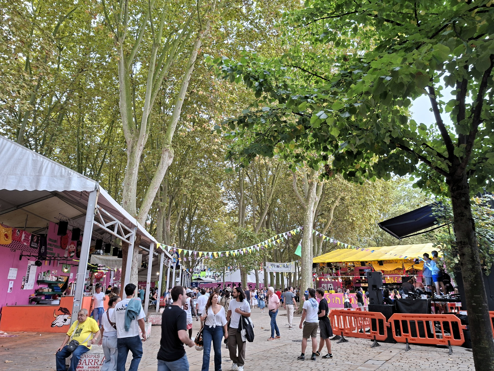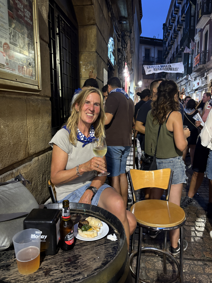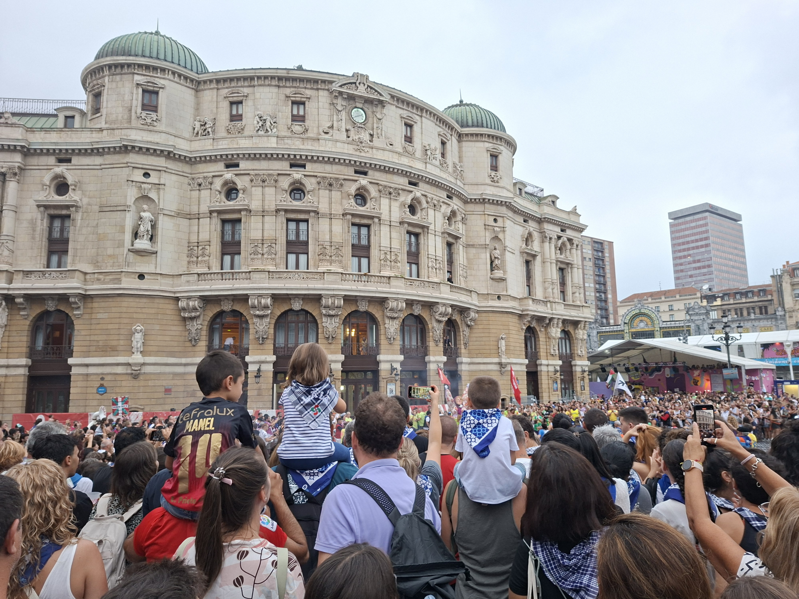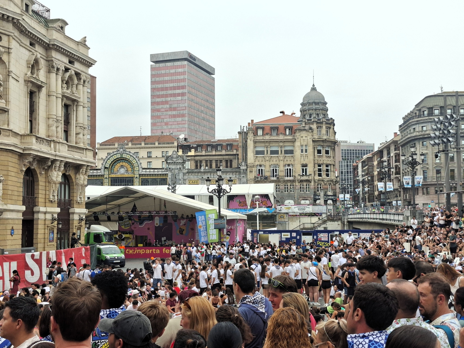 Wir sind zu einer guten Zeit angekommen, am Samstag beginnt die wichtigste und größte Fiesta von Bilbao: Aste Nagusia, die Semana Grande. Nicht gewöhnliche sieben, sondern neun Tage hat diese Festwoche rund um die baskische Kultur mit ihren Konzert-, Theater- und Folkloreaufführungen. Mit der Metro sind die zehn Kilometer bis ins Zentrum schnell geschafft. Viele Tausend Menschen tummeln sich hier, die Stimmung ist ausgelassen. Fast alle haben ein blau-weiß gemustertes Halstuch umgebunden, als Symbol der Zugehörigkeit und festlichen Gemeinschaft, da möchten auch wir nicht außen vor bleiben. Und noch etwas fällt auf: die allgegenwärtigen Palästina-Flaggen. Die Solidarität mit den Palästinensern ist hier riesig und das wird gezeigt. Wir lassen uns stundenlang durch die engen Gassen treiben, bummeln am Río Nervión entlang und erklimmen die Hügel der Stadt – was natürlich hungrig macht. Dagegen helfen hervorragend Pintxos, in dieser Region typische fantasievolle kleine Happen, die auf einer Scheibe Brot angerichtet und mit einem Zahnstocher zusammengehalten werden. So probieren wir uns von Bar zu Bar, mehr Abwechslung geht kaum, die Konstante ist der weiße, trockene Txakoli-Wein, der so perfekt dazu passt. Immer um 22.30 Uhr hält Bilbao dann für eine Weile inne, Stadtbeleuchtung und Musik werden ausgeschaltet und Feuerwerk erhellt krachend den Nachthimmel. Bei diesem internationalen pyrotechnischen Wettbewerb ist jede Nacht ein anderes Land dran. Doch egal welches: Kaum verglüht die letzte Rakete, wird energisch weiter gefeiert und auch wir schauen, ob wir noch irgendwo Musik finden, die uns mitreißt.