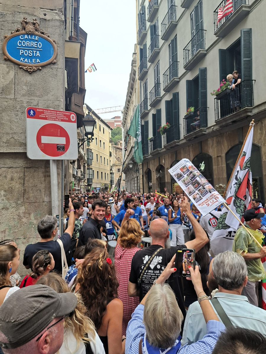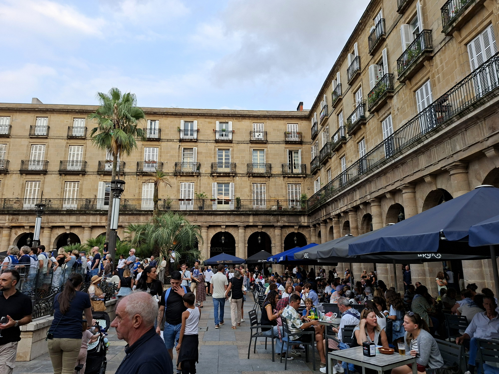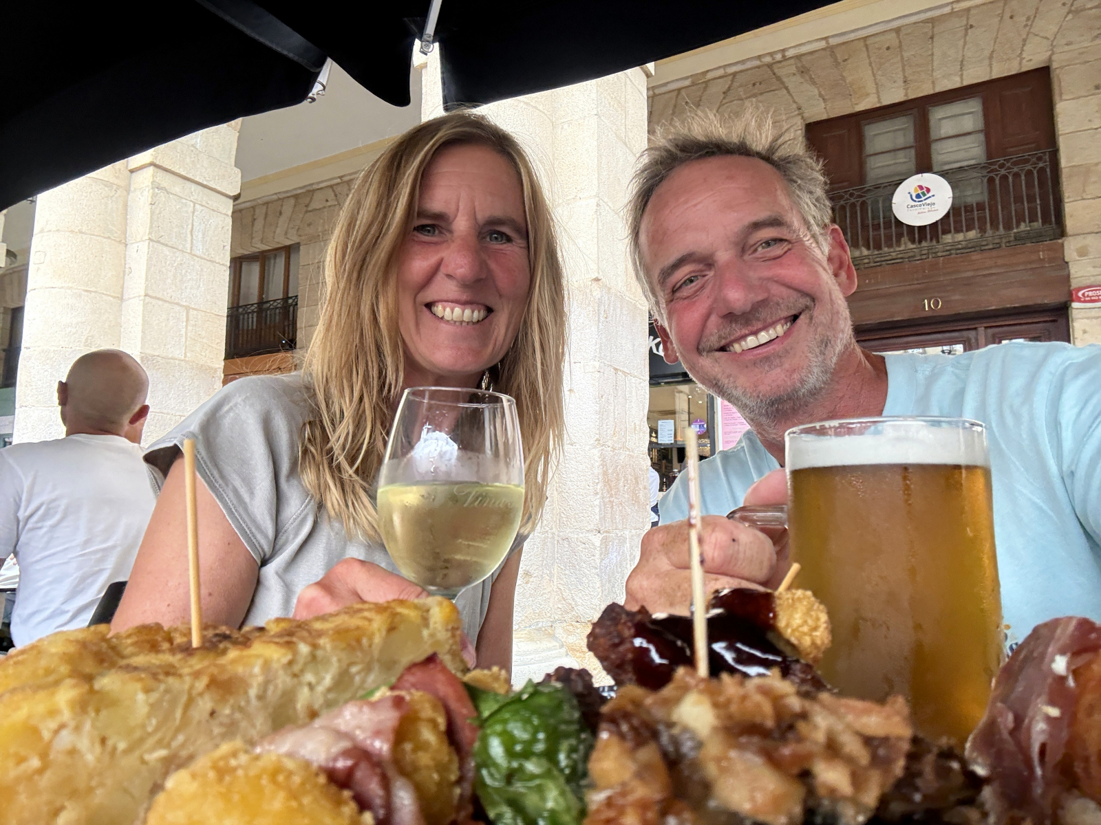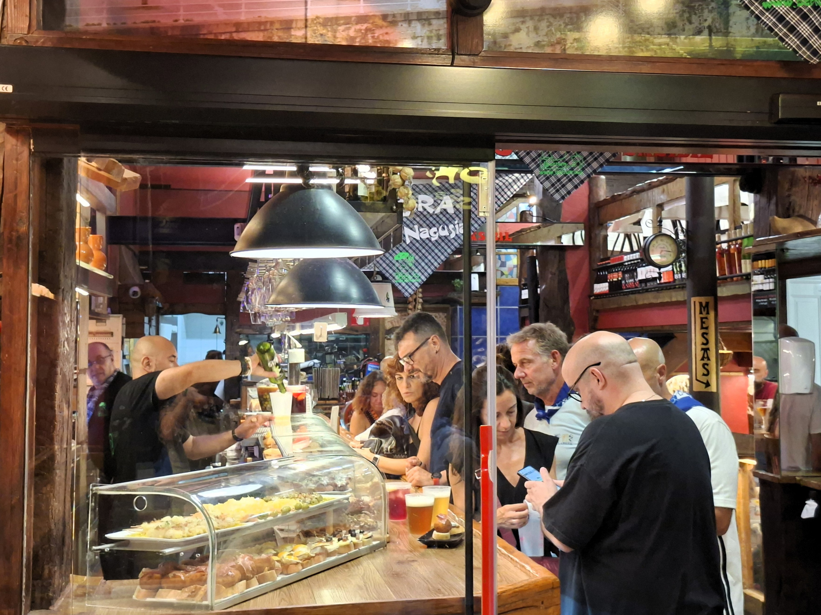 Wir sind zu einer guten Zeit angekommen, am Samstag beginnt die wichtigste und größte Fiesta von Bilbao: Aste Nagusia, die Semana Grande. Nicht gewöhnliche sieben, sondern neun Tage hat diese Festwoche rund um die baskische Kultur mit ihren Konzert-, Theater- und Folkloreaufführungen. Mit der Metro sind die zehn Kilometer bis ins Zentrum schnell geschafft. Viele Tausend Menschen tummeln sich hier, die Stimmung ist ausgelassen. Fast alle haben ein blau-weiß gemustertes Halstuch umgebunden, als Symbol der Zugehörigkeit und festlichen Gemeinschaft, da möchten auch wir nicht außen vor bleiben. Und noch etwas fällt auf: die allgegenwärtigen Palästina-Flaggen. Die Solidarität mit den Palästinensern ist hier riesig und das wird gezeigt. Wir lassen uns stundenlang durch die engen Gassen treiben, bummeln am Río Nervión entlang und erklimmen die Hügel der Stadt – was natürlich hungrig macht. Dagegen helfen hervorragend Pintxos, in dieser Region typische fantasievolle kleine Happen, die auf einer Scheibe Brot angerichtet und mit einem Zahnstocher zusammengehalten werden. So probieren wir uns von Bar zu Bar, mehr Abwechslung geht kaum, die Konstante ist der weiße, trockene Txakoli-Wein, der so perfekt dazu passt. Immer um 22.30 Uhr hält Bilbao dann für eine Weile inne, Stadtbeleuchtung und Musik werden ausgeschaltet und Feuerwerk erhellt krachend den Nachthimmel. Bei diesem internationalen pyrotechnischen Wettbewerb ist jede Nacht ein anderes Land dran. Doch egal welches: Kaum verglüht die letzte Rakete, wird energisch weiter gefeiert und auch wir schauen, ob wir noch irgendwo Musik finden, die uns mitreißt.