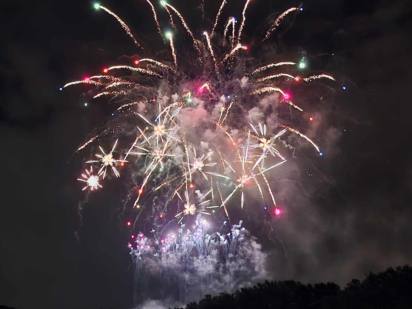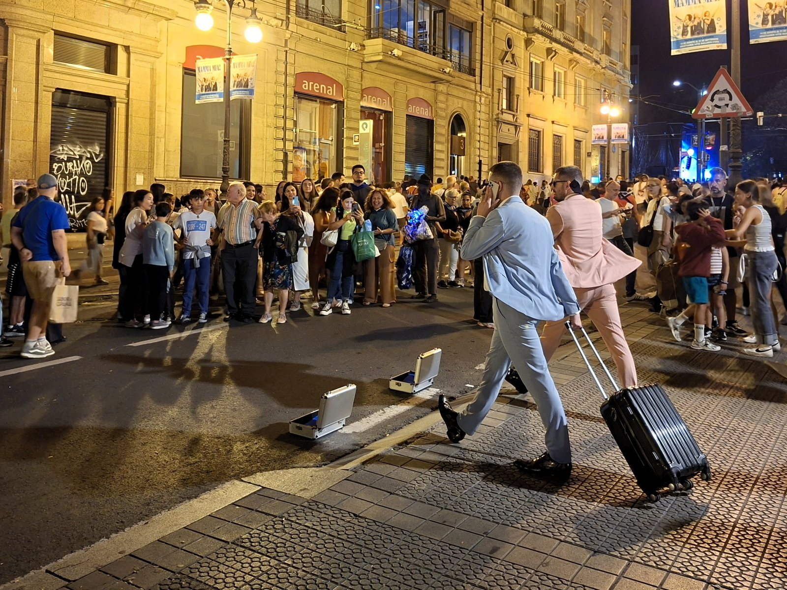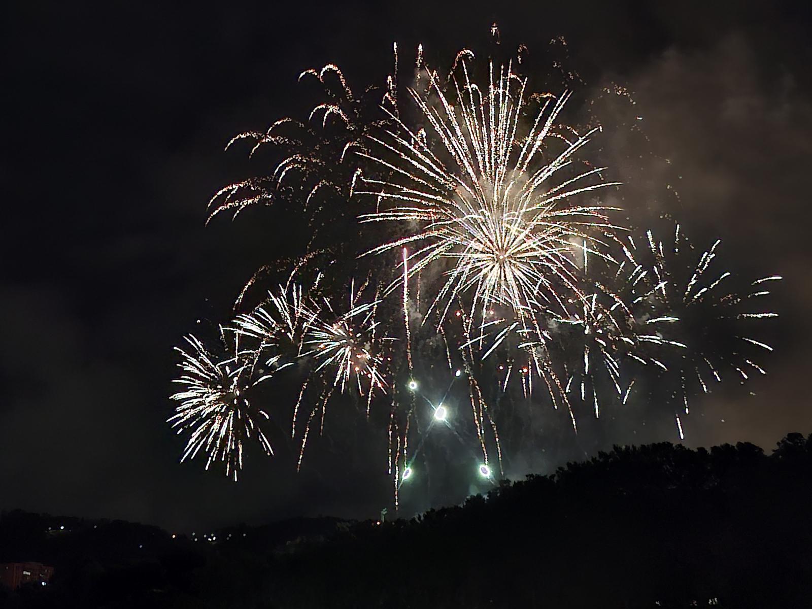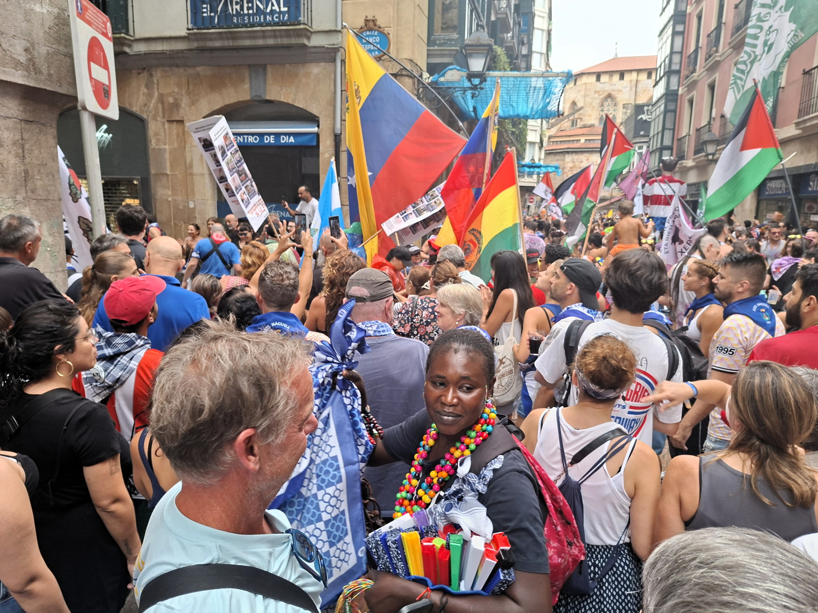 Wir sind zu einer guten Zeit angekommen, am Samstag beginnt die wichtigste und größte Fiesta von Bilbao: Aste Nagusia, die Semana Grande. Nicht gewöhnliche sieben, sondern neun Tage hat diese Festwoche rund um die baskische Kultur mit ihren Konzert-, Theater- und Folkloreaufführungen. Mit der Metro sind die zehn Kilometer bis ins Zentrum schnell geschafft. Viele Tausend Menschen tummeln sich hier, die Stimmung ist ausgelassen. Fast alle haben ein blau-weiß gemustertes Halstuch umgebunden, als Symbol der Zugehörigkeit und festlichen Gemeinschaft, da möchten auch wir nicht außen vor bleiben. Und noch etwas fällt auf: die allgegenwärtigen Palästina-Flaggen. Die Solidarität mit den Palästinensern ist hier riesig und das wird gezeigt. Wir lassen uns stundenlang durch die engen Gassen treiben, bummeln am Río Nervión entlang und erklimmen die Hügel der Stadt – was natürlich hungrig macht. Dagegen helfen hervorragend Pintxos, in dieser Region typische fantasievolle kleine Happen, die auf einer Scheibe Brot angerichtet und mit einem Zahnstocher zusammengehalten werden. So probieren wir uns von Bar zu Bar, mehr Abwechslung geht kaum, die Konstante ist der weiße, trockene Txakoli-Wein, der so perfekt dazu passt. Immer um 22.30 Uhr hält Bilbao dann für eine Weile inne, Stadtbeleuchtung und Musik werden ausgeschaltet und Feuerwerk erhellt krachend den Nachthimmel. Bei diesem internationalen pyrotechnischen Wettbewerb ist jede Nacht ein anderes Land dran. Doch egal welches: Kaum verglüht die letzte Rakete, wird energisch weiter gefeiert und auch wir schauen, ob wir noch irgendwo Musik finden, die uns mitreißt.