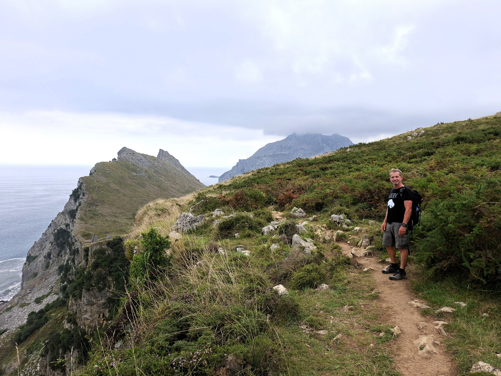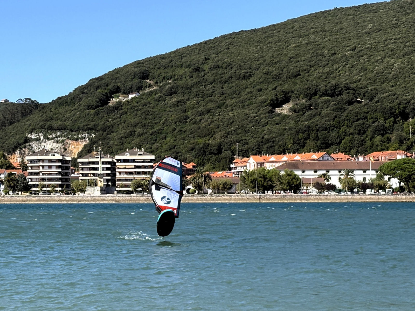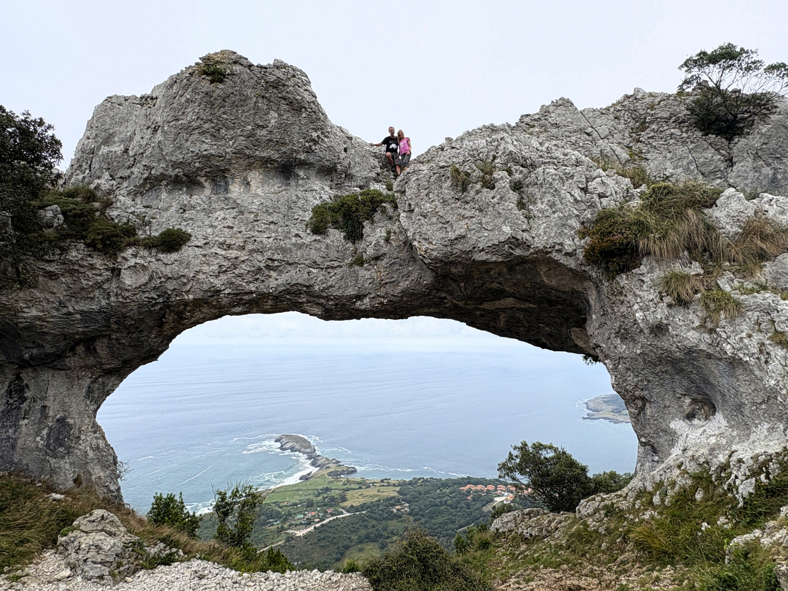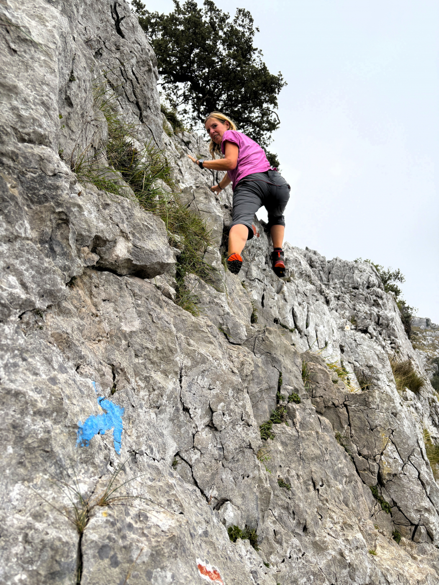 Die Woche in Laredo verfliegt rasant, denn auch außerhalb der Blumenschlacht ist viel zu erleben und zu tun. So bietet sich endlich wieder die Gelegenheit zum Wingsurfen! Heiko beginnt sogar mit dem Foilen und schafft es erste Male kurz aus dem Wasser. Dann gibt es hier gute Wandermöglichkeiten: Zum Warmwerden fahren wir mit der kleinen Pendelfähre, die direkt am Strand startet, rüber in den Nachbarort Santoña, laufen von dort den Küstenweg entlang zum Faro del Caballo inklusive der 763 Stufen, die hinunterführen. So viele schöne Views unterwegs! Unsere Lieblingstour aber führt von Laredo ostwärts, zu den Ojos del Diablo. Beim Start finden wir es noch schade, dass die Sonne nicht scheint, später sind wir angesichts der 820 Höhenmeter, verteilt auf 17 Kilometer, ganz froh, nicht noch mehr schwitzen zu müssen. Eine schöne, abwechslungsreiche Strecke mit kleinen Kletterpassagen, landschaftlich wunderbar, nicht überlaufen (mehr Ziegen als andere Touris), dazu sind die Teufelsaugen im Fels ein tolles Ziel. Und drum herum hatten wir es schön gesellig: Seit Bilbao segeln die beiden Kölner Eva und Kim mit ihrer SY Mana wieder parallel, außerdem leisteten Liek und Paul, die niederländische Crew der SY Shiva, uns Gesellschaft. So konnten wir nicht nur das Blumen-Finale zu sechst genießen, sondern auch Tapas- und sonstige leckere Abende zusammen verbringen und unter Lieks Anleitung Yoga üben. Nun haben sich die Wege teils getrennt, wir ankern gerade neben der Mana vor Santander, sind gestern bei rund zweieinhalb Metern Welle hierher gemotorsegelt. Morgen ziehen wir wohl in die Marina um, es wird wieder ungemütlich.