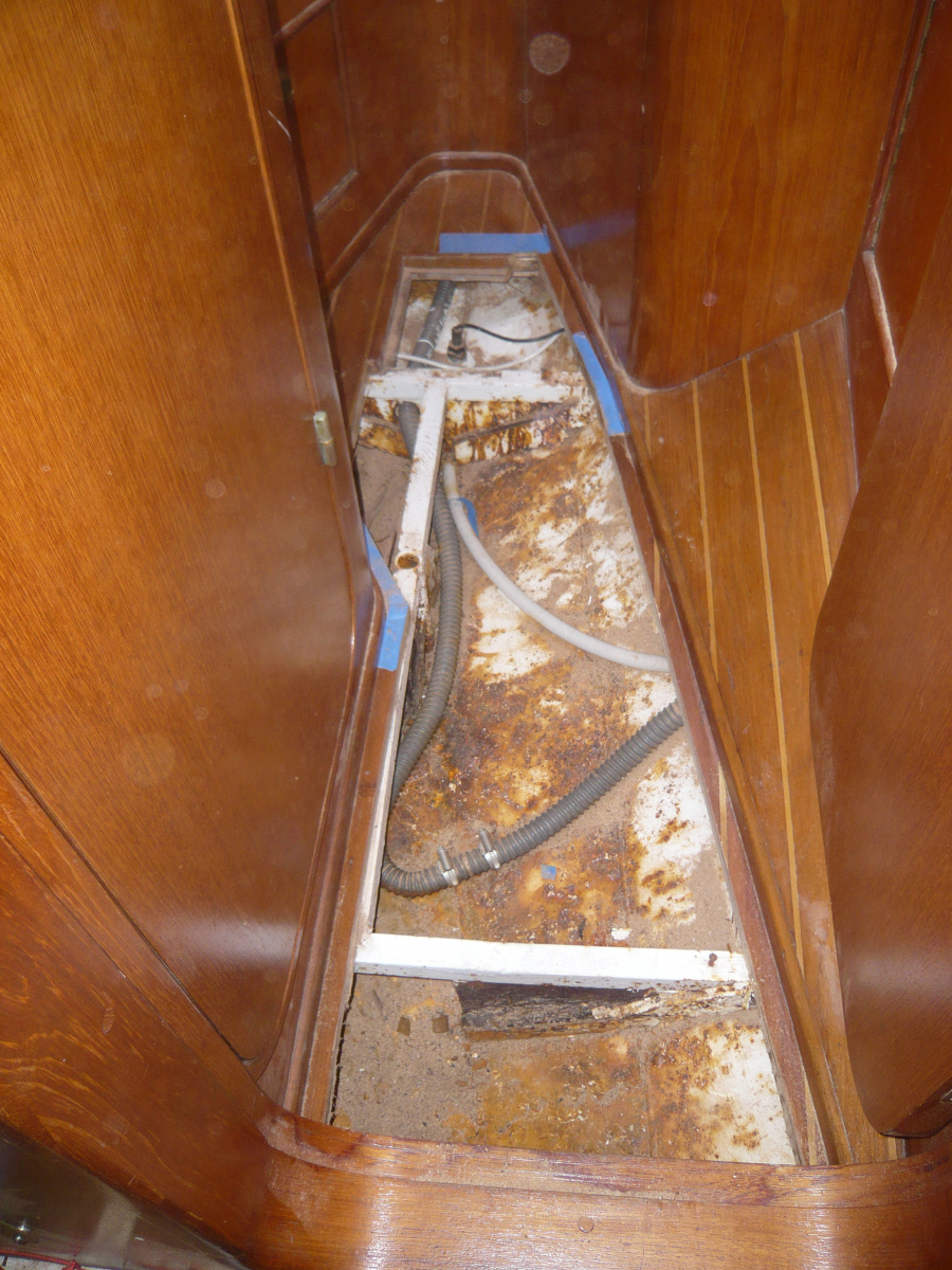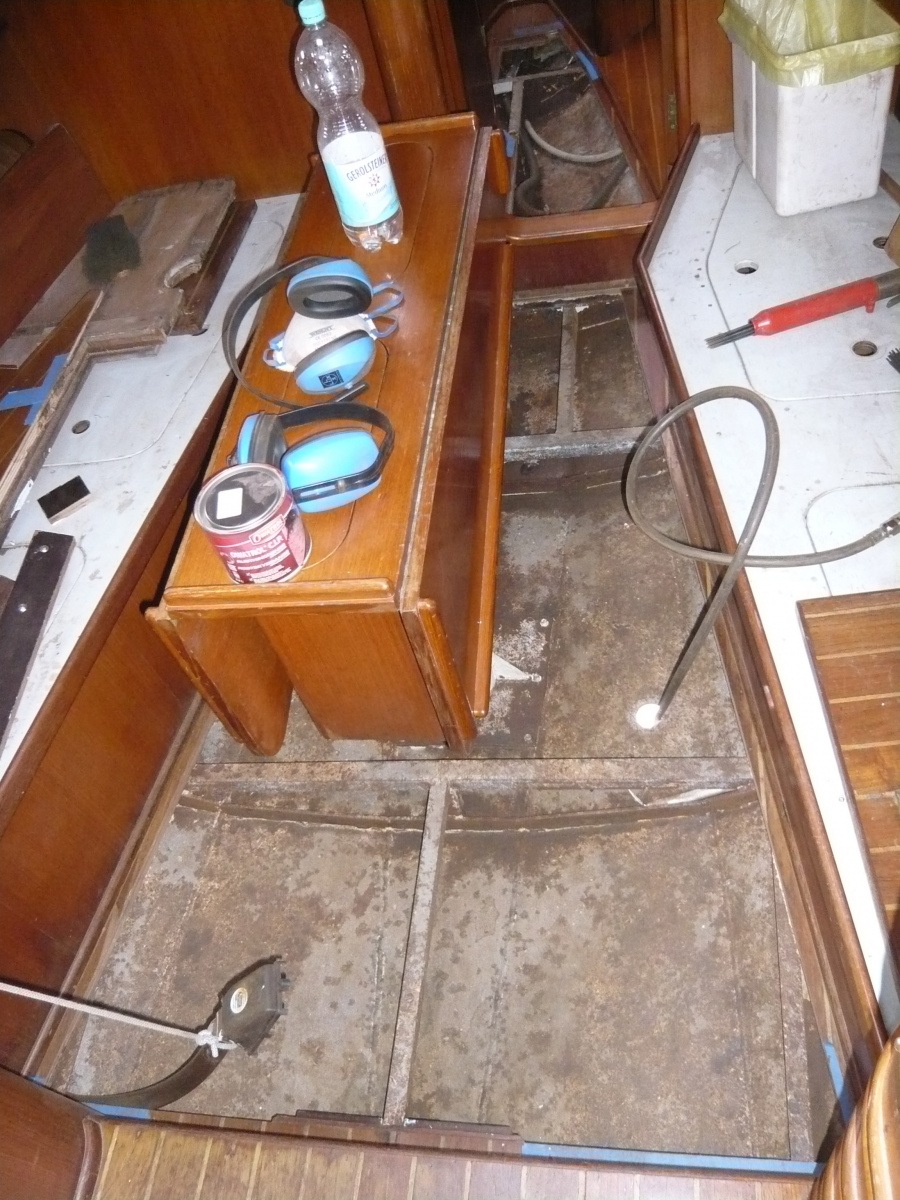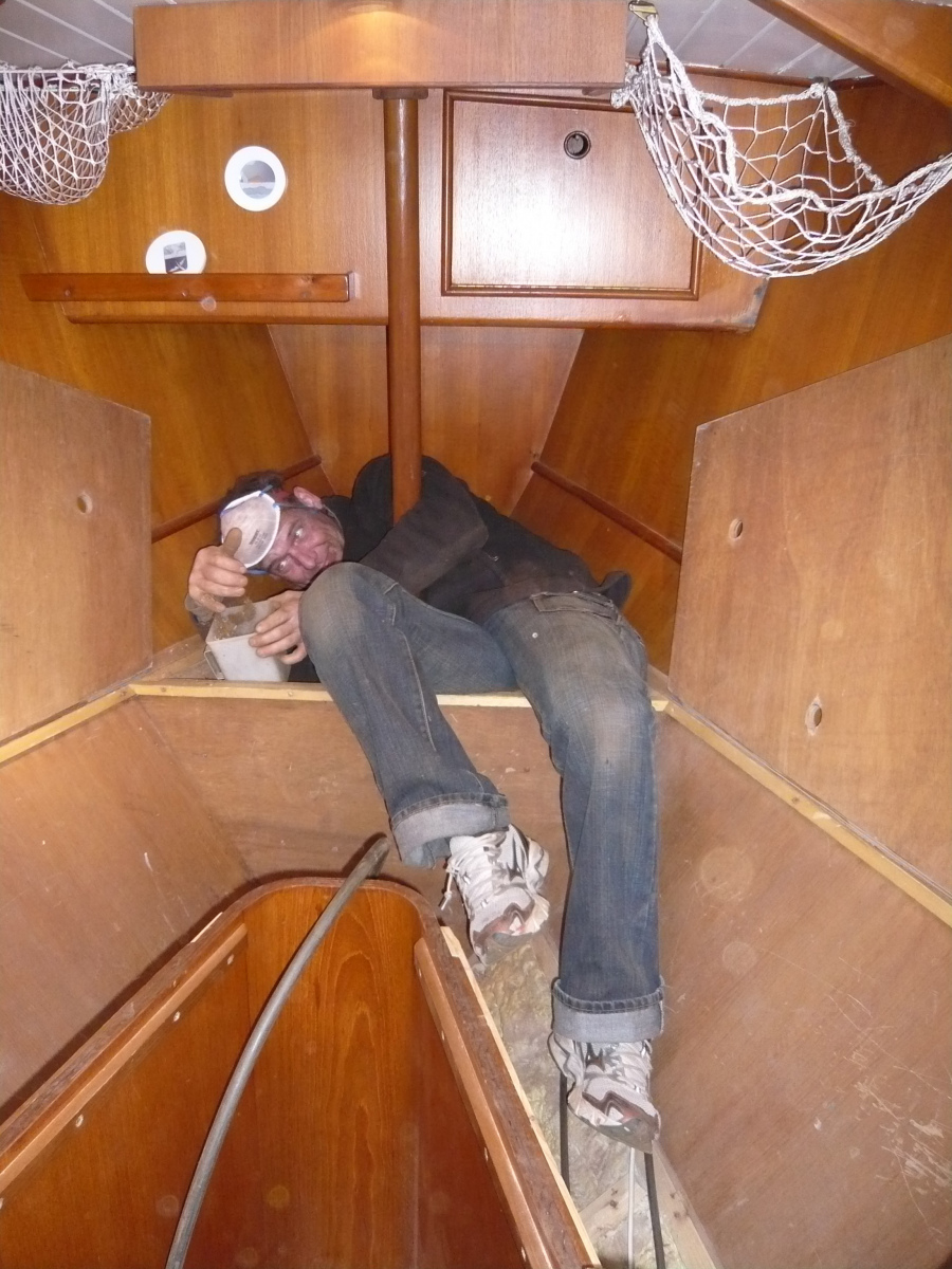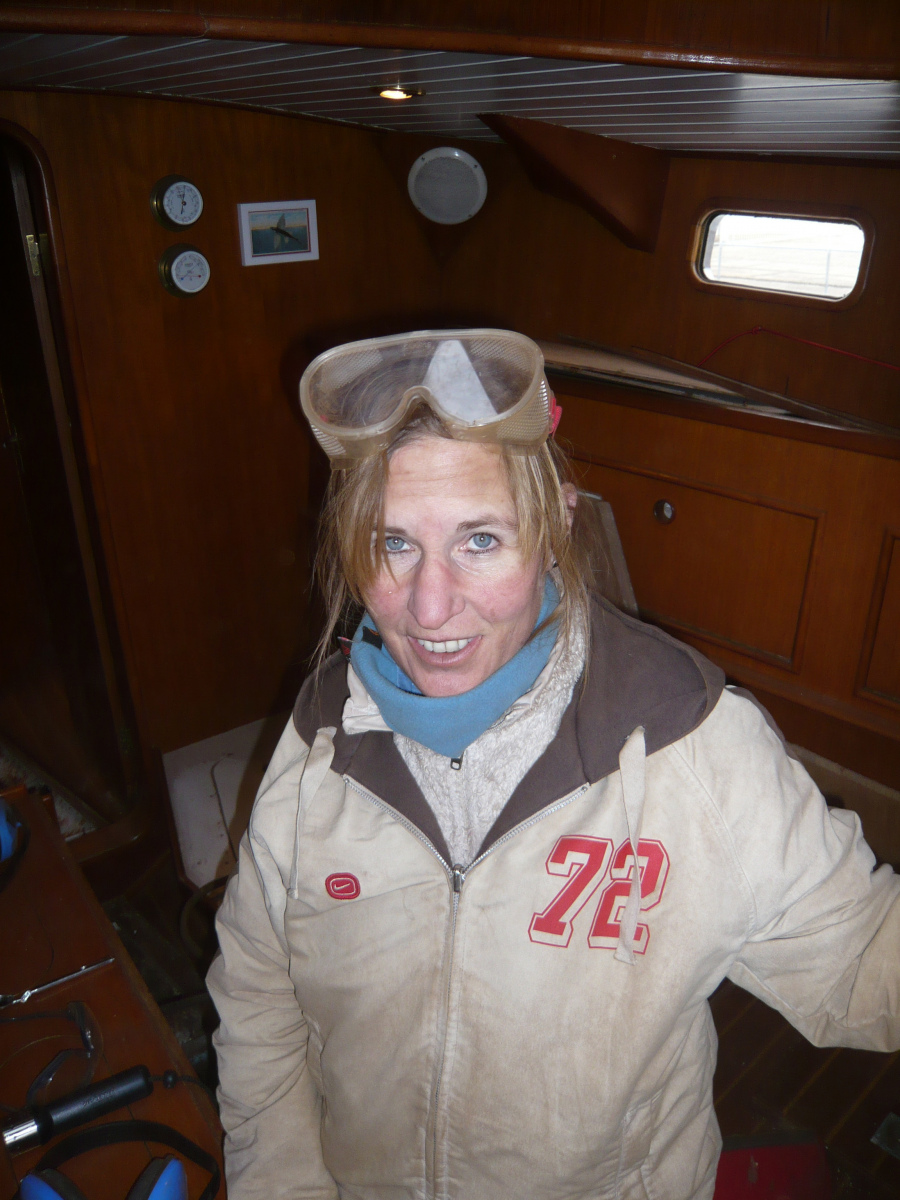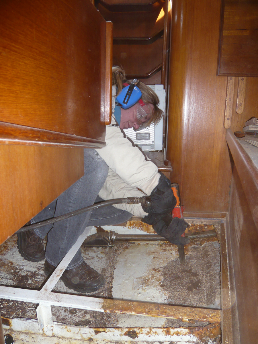 Als nächstes geht es dem Bilgen-Rost in Salon, Vorschiff und Ankerkasten an den Kragen. Deren Zustand war einer der gravierendsten Kritikpunkte des Gutachters im letzten Jahr. „Stahlschiffe rosten immer von innen nach außen durch“, warnte er uns. Den Holzboden in Salon und Vorschiff lassen wir von einem Profi herausnehmen, überarbeiten und später wieder einpassen, das selbst zu tun scheint uns zu riskant, wir möchten auf jeden Fall den alten Original-Boden behalten. In den folgenden Tagen stellen wir nach dem Kälte- auch noch unseren Schmutz-Rekord auf. Mit dem Lufthammer der Heijsman-Werft entfernen wir Unmengen Rost und Dreck, der uns um die Mickymaus-geschützten Ohren fliegt und sich in jeder Pore festsetzt. Unser Teint sieht in den nächsten Tagen immer leicht künstlich und überschminkt aus. Da die seitlich gelegenen Stellen der Bilge kaum zu erreichen sind, werden auch unsere Knie ziemlich in Mitleidenschaft gezogen. Aber bis zur Röckchen-Saison ist es eh noch lange hin, sofern sie in Holland überhaupt stattfindet. Nach zwei Anstrichen mit Owatrol machen wir erleichtert einen Haken an das Bilgen-Thema.