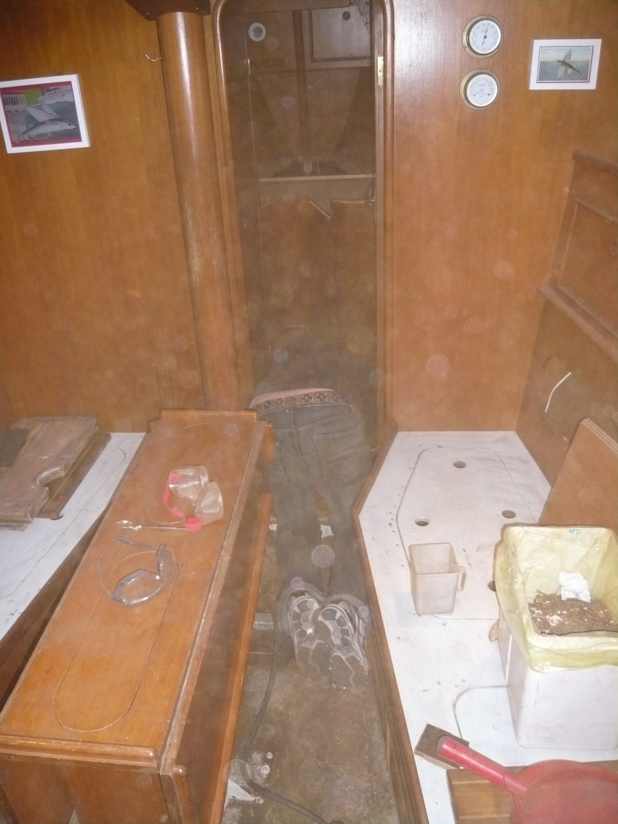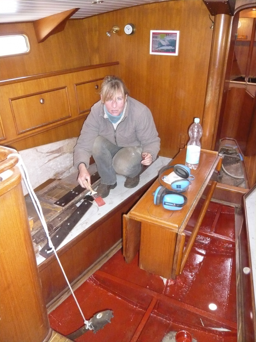 Dort folgen in der nächsten Zeit Premieren wie der erste Ölwechsel und der erste Impellerwechsel und endlich die lang ersehnten kosmetischen Holzarbeiten: wir bauen das zu Hause vorbereitete neue Instrumentenbrett ein, das Multifunktionsdisplay wird in seinem Holzgehäuse neben dem Niedergang befestigt, der Tablet-PC bekommt eine maßgefertigte Halterung auf dem Kartentisch. Alles passt wie erhofft und wir genießen, dass es an Bord endlich wieder schön und gemütlich wird. Mit den üblichen kleinen Dämpfern zwischendurch: der neue Triducer lässt sich nicht in unser Bordnetzwerk einbinden, so dass uns unser Lieblingsversender ein Ersatzgerät schickt. Der Austausch funktioniert, indem man „den Stöpsel zieht“. Für einige Sekunden – je nachdem, wie schusselig man sich anstellt – ist währenddessen ein Loch von fünf Zentimetern Durchmesser im Schiffsboden, durch das mit recht ordentlichem Druck Wasser aus dem Hafenbecken herein sprudelt. Heiko findet solche Aktionen seltsamerweise lustig, ich dagegen bin froh, als wir die Sache mit einem vergleichsweise geringen Wassereinbruch inklusive einer kleinen hereingespülten Krabbe hinter uns haben. Leider überlebt die Krabbe nicht. Deutlich nasser wird die Bilge, als wir bei der Befüllung des Wassertanks feststellen, dass wir diesen bei den Entrostungsarbeiten mit dem Lufthammer zerstört haben. Er entleert sich eins zu eins ins Schiff, wenigstens bemerken wir es früh.