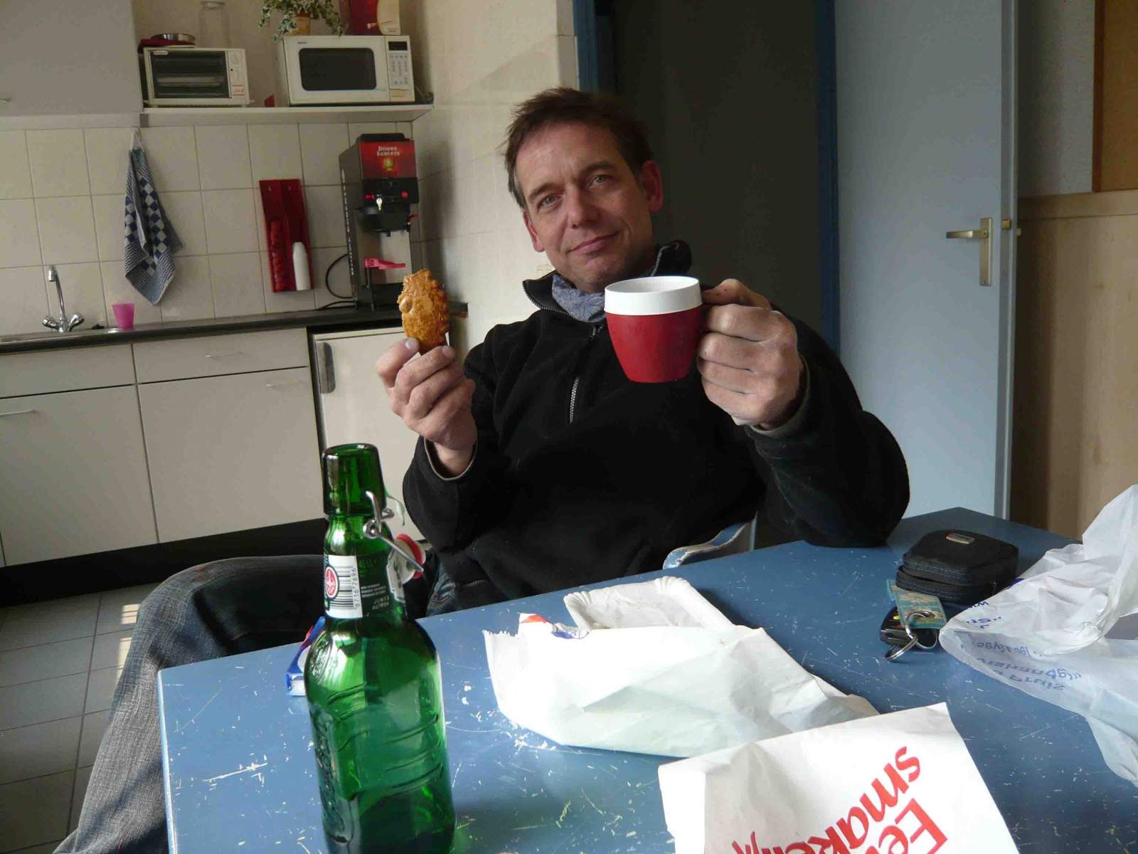 Zu Beginn widmen wir uns dem Unterwasserschiff. Auf das Abkratzen des alten Antifoulings folgt unsere erste Begegnung mit Aluminium-Primer. Beeindruckend: weil wir den Primer nicht aus dem großen, vollen Eimer mit Schwung in die Farbschale schütten wollen, benutzen wir eine dünne Plastiktasse zum Umfüllen. Als wir diesen Vorgang nach einer halben Stunde wiederholen wollen, ist von der Tasse nur noch der Rand da – einfach weggeätzt! Wir nehmen die für uns neuen Produkte fortan etwas ernster. Das Wetter soll ab dem folgenden Tag noch fieser werden und so hauen wir richtig rein. Die letzten Lücken im neuen Antifouling rollen wir bei einbrechender Dunkelheit auf das Unterwasserschiff und haben am Schluss das Gefühl, dass uns die Finger in den Skihandschuhen längst abgefroren sind. Was sind noch mal Behaglichkeit und Wärme? Nur die kurzen Aufenthalte im Pausenraum der Werft und deren immer eingeschaltete Kaffeemaschine lassen uns dies gelegentlich erinnern.