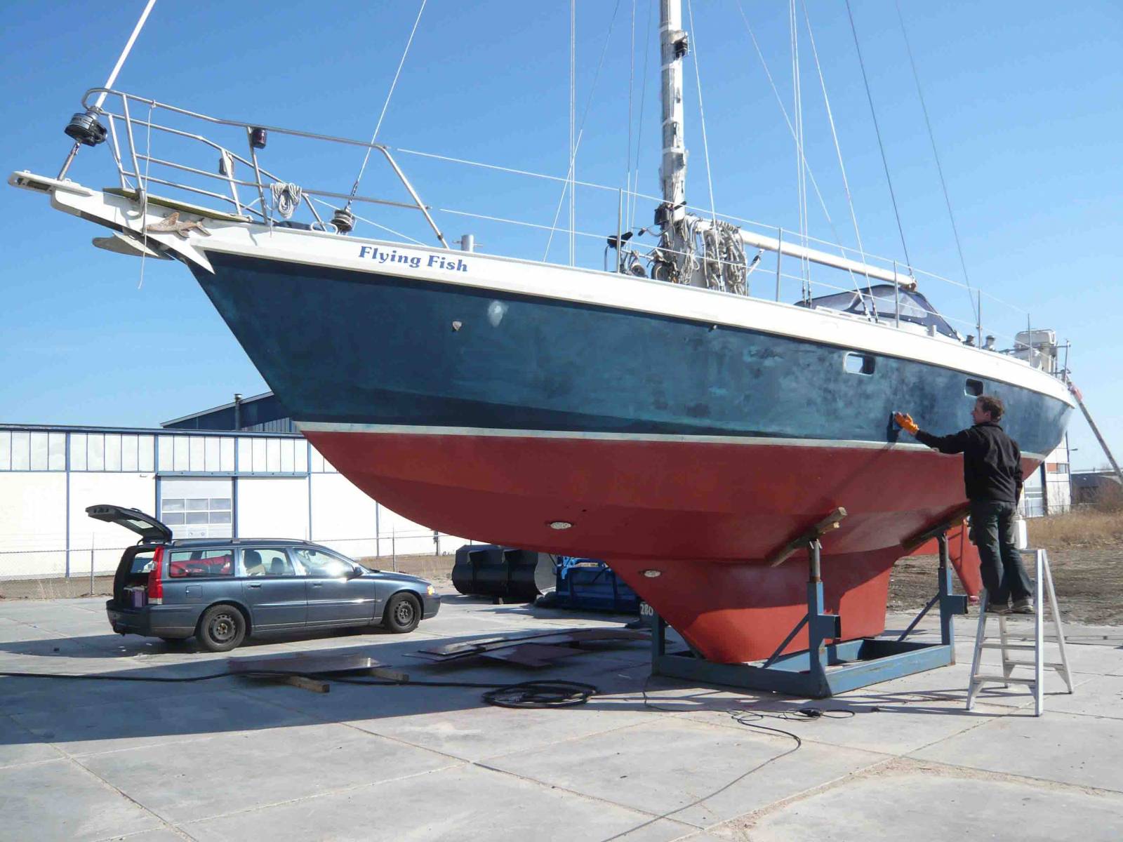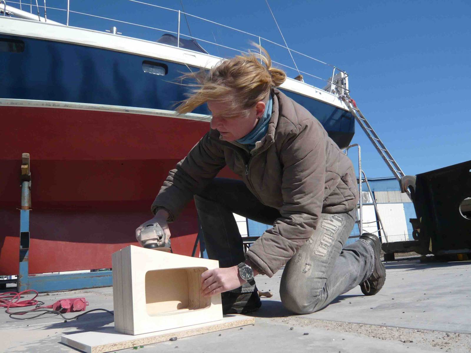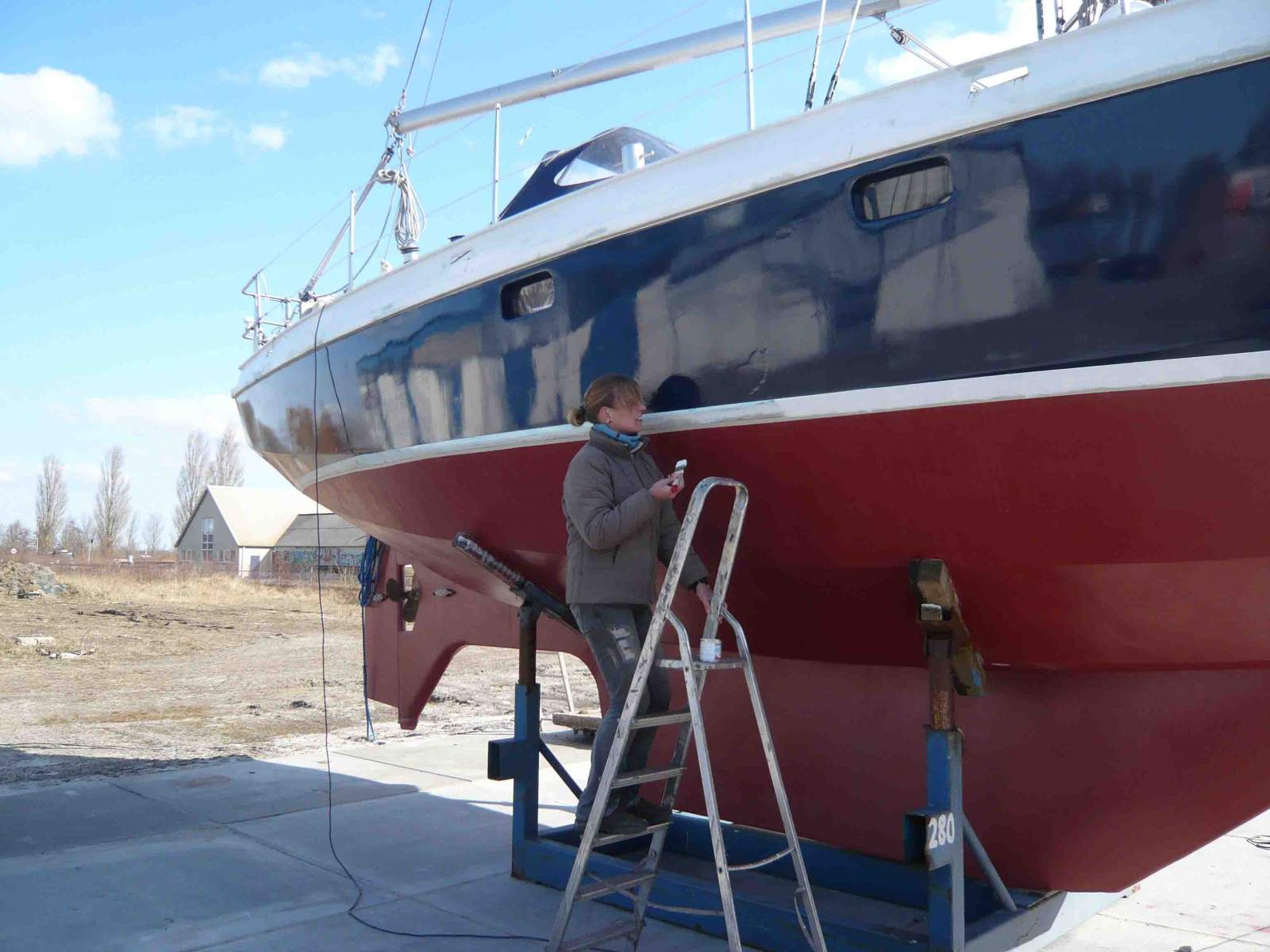 Eigentlich steht jetzt die neue Lackierung des Rumpfes an, doch wegen des Wetters verschieben wir diese Arbeit immer wieder. Zwar ist es jetzt halbwegs freundlich draußen, aber es fehlen acht bis zehn Grad Celsius. Statt des Lacks erledigen wir also Technisches im Inneren des Schiffes, immer darauf bedacht, uns dabei möglichst zwischen den beiden Heizlüftern aufzuhalten. Wir bauen unseren neuen Triducer ein, der zukünftig als Tiefenmesser und Logge fungieren soll. Außerdem bereiten wir die Installation und Vernetzung von Bidata und Multifunktionsdisplay vor, das Holz-Gehäuse für letzteres entsteht zwischendurch auf dem Hof der Werft, wo der beständig starke Wind freundlicherweise das Auffegen des Flex-Staubes erspart. Am Schluss lackieren wir den Rumpf doch, obwohl es immer noch zu kalt ist. Aber der Krantermin ist vereinbart und unsere Geduld genauso am Ende wie die Urlaubstage. Als größte Herausforderung erweist sich, die lackgetränkten Rollen und Pinsel von der Farbschale bis zum Schiff zu bewegen, ohne dass die Farbe wegfliegt. Wunderschön sieht es aus, wie alte Flecken und Ausbesserungen nach und nach unter dem wunderbar dunklen Blau verschwinden. Jetzt noch den Wasserpass pinseln und fertig. Unser Bedarf an körperlicher Arbeit ist für einige Zeit gedeckt und wir wissen endlich, wie Winterlager geht.